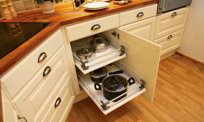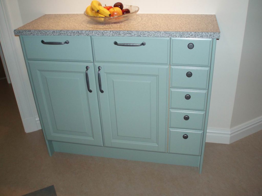 Dekorativ sockerbitslist och infälld belysning i skåpen. Maskindraget antikglas.